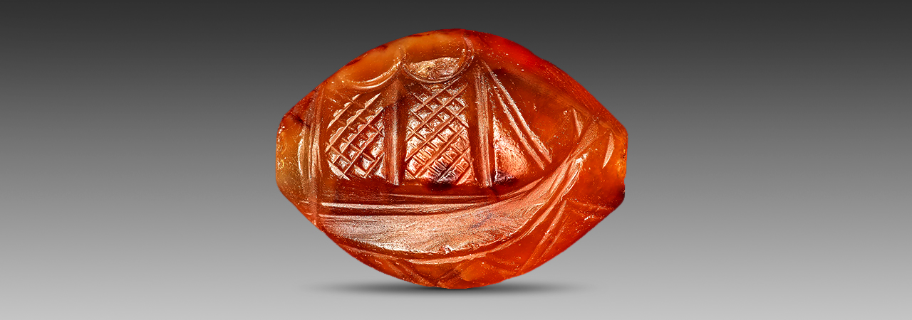 This precious carnelian bead showing a sailing ship was found on the island of Crete, home to the Minoans – a civilisation centred on the city of Knossos. They grew rich through warfare and maritime trade. Ships like this brought carnelian and other high-value goods from the East. A sailor may have worn this to ward off evil.