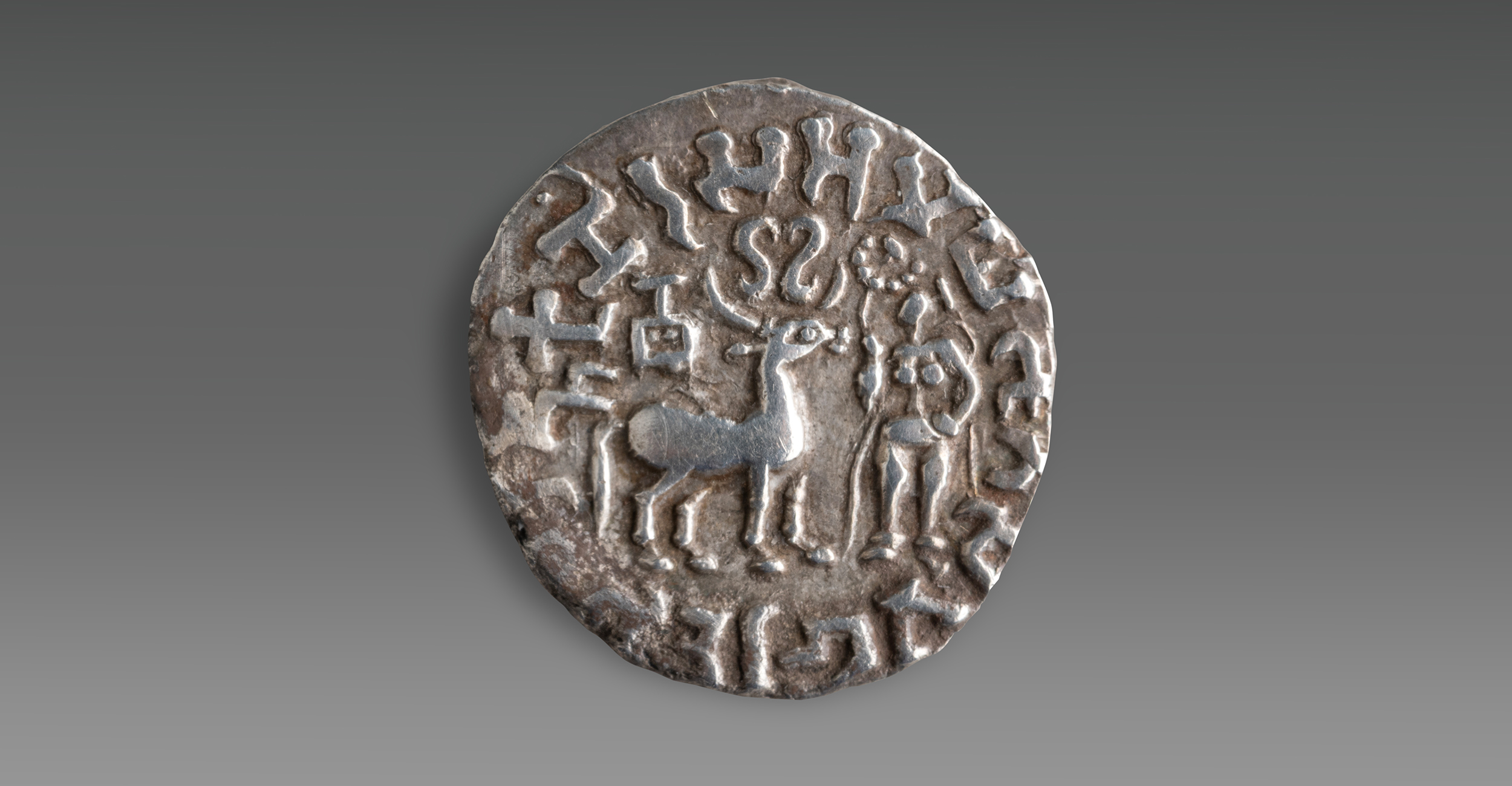 Obv: Deer facing right, Goddess Lakshmi holding lotus in her upraised right hand; square vase above deer’s back; Srivatsa between its horns; a dotted sun behind the deer’s hind leg Brahmi legend around (from 9 o’clock) rajnah kunidasa amoghabhutisa maharajasa