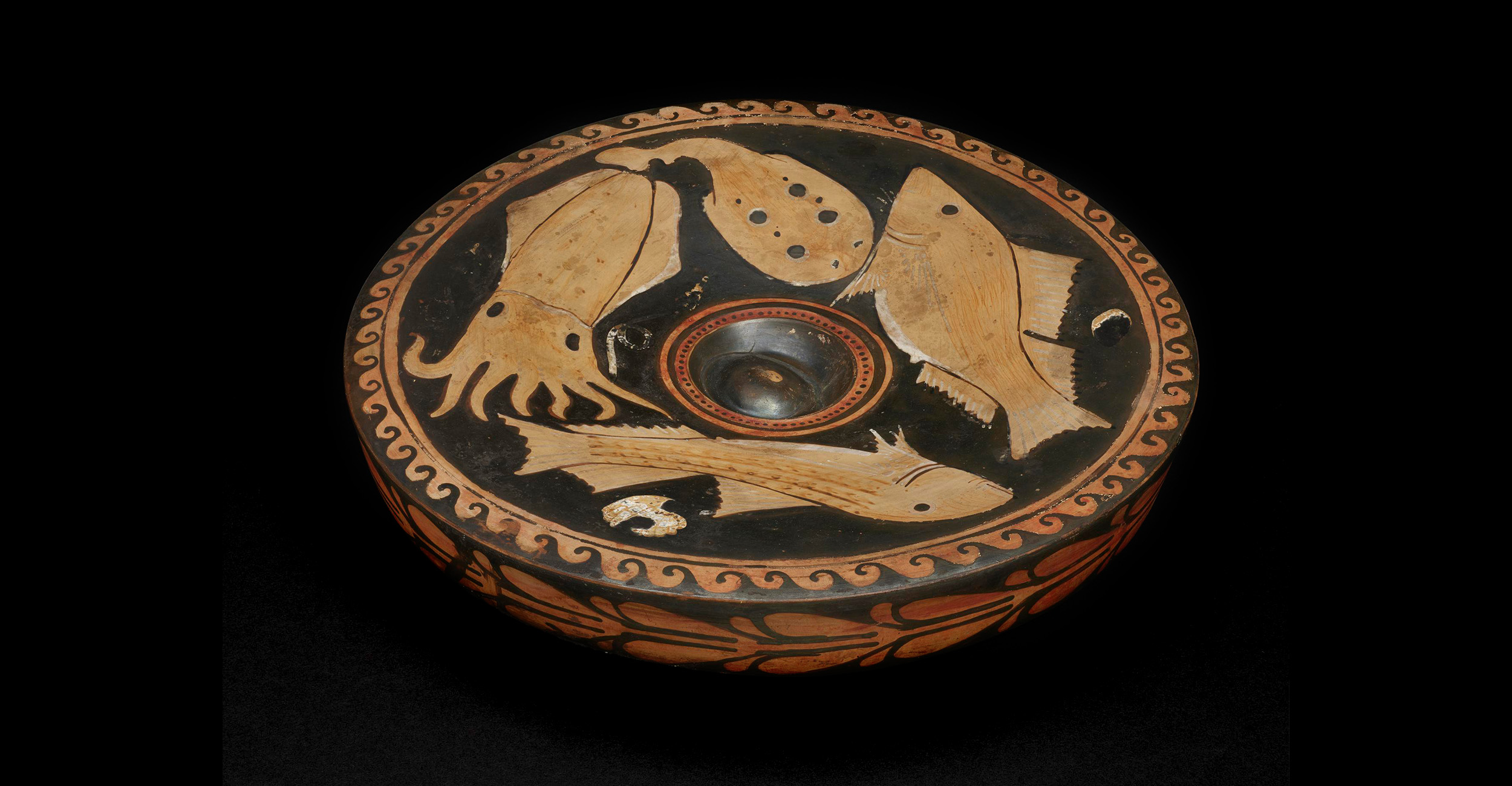 Greeks loved fish at their feasts, and Greek settlers in southern Italy often placed plates like this in tombs. The centre of the plate held oil or spicy sauce.