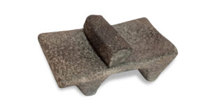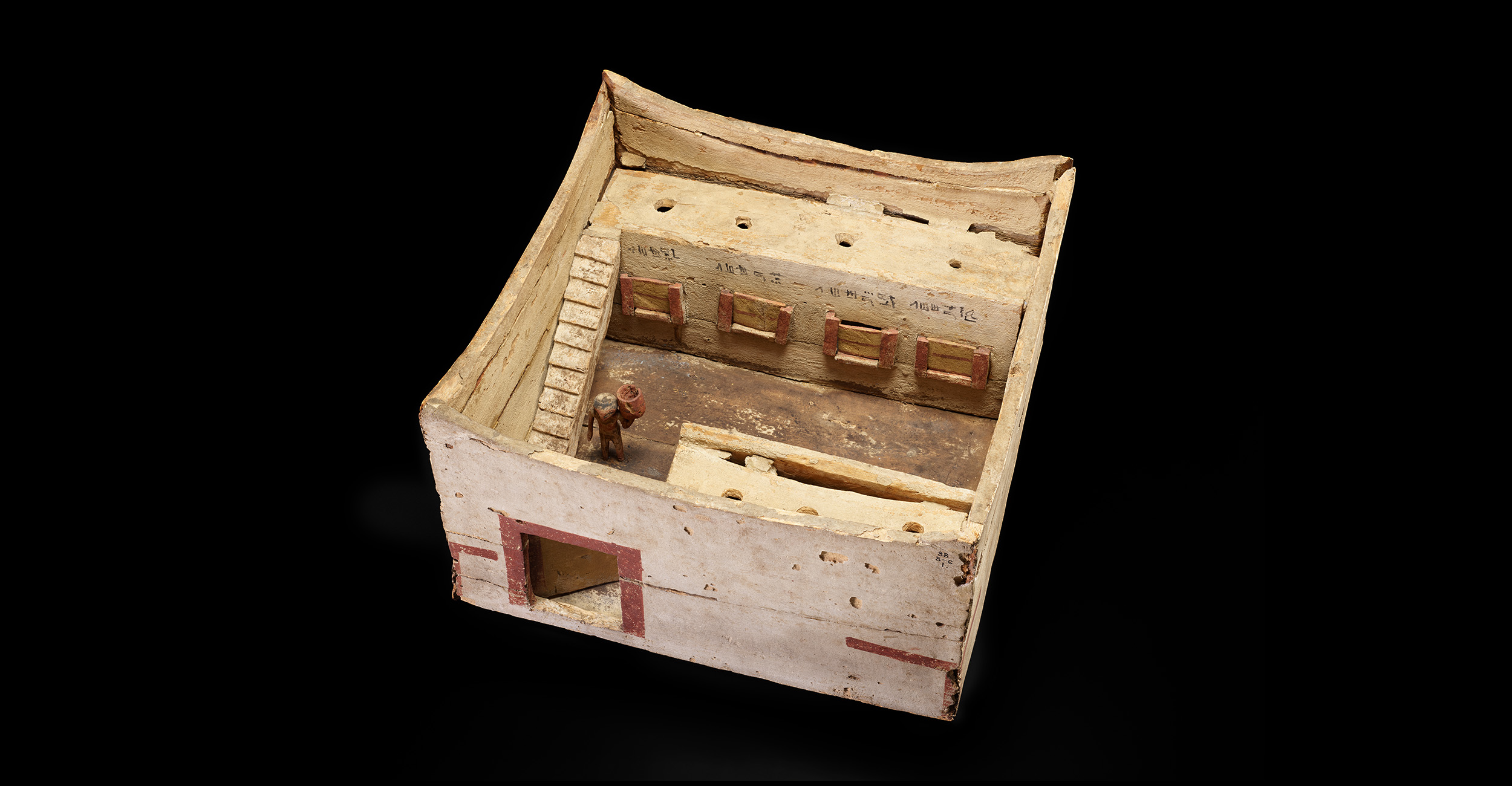 A typical ancient Egyptian granary model placed in a tomb. Hieroglyphic inscriptions identify the content of the seven bins – barley, wheat, corn, fruits and beans. These would be poured in through holes on the top and taken out through the shutters below. On the floor are some grains scattered as a worker carries a drum-shaped measuring pail.