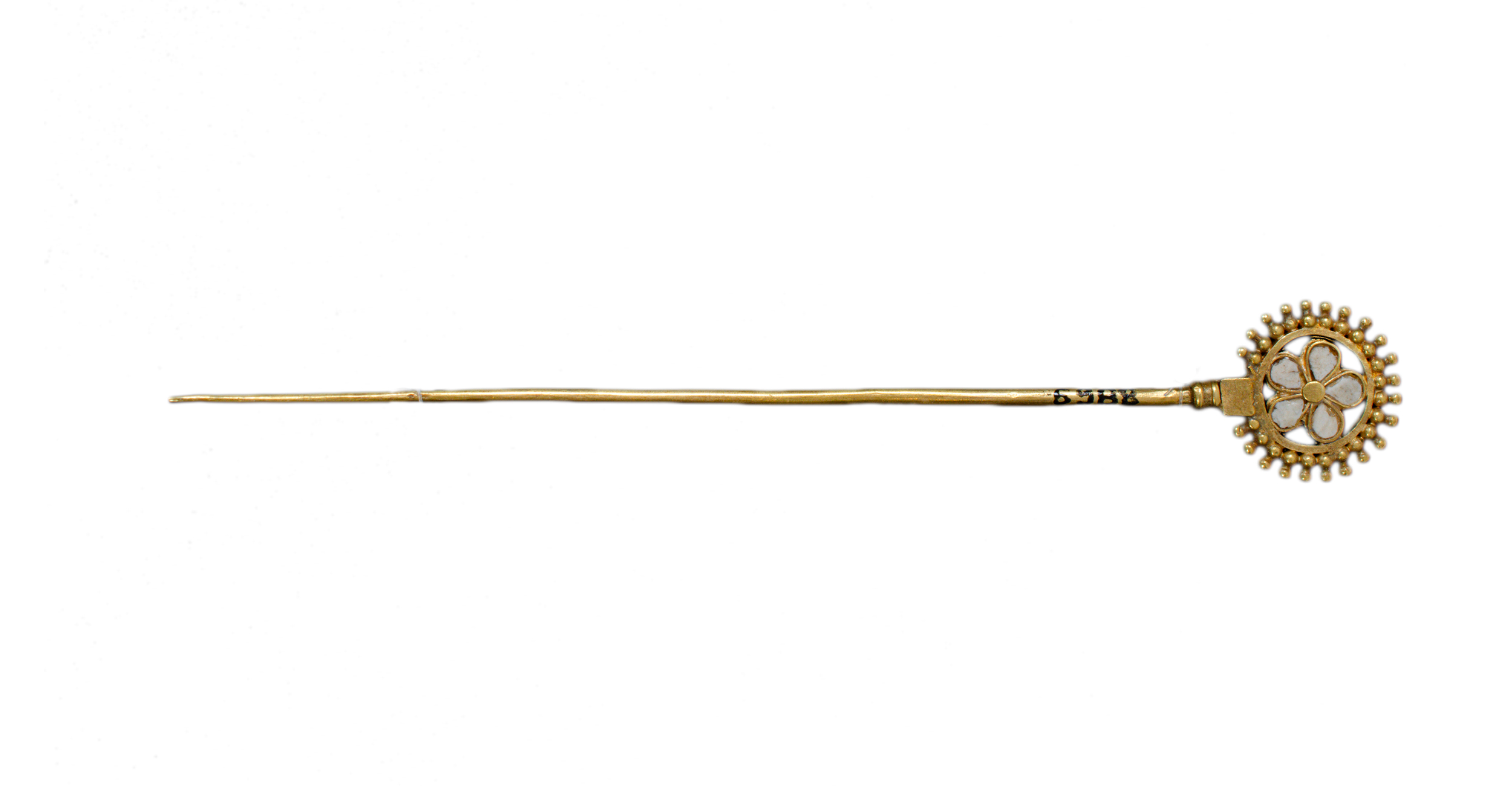The hair pin of gold with flat wheel head decorated on both sides with a five-petalled flower inlaid and encircled by two rows of gold beading.