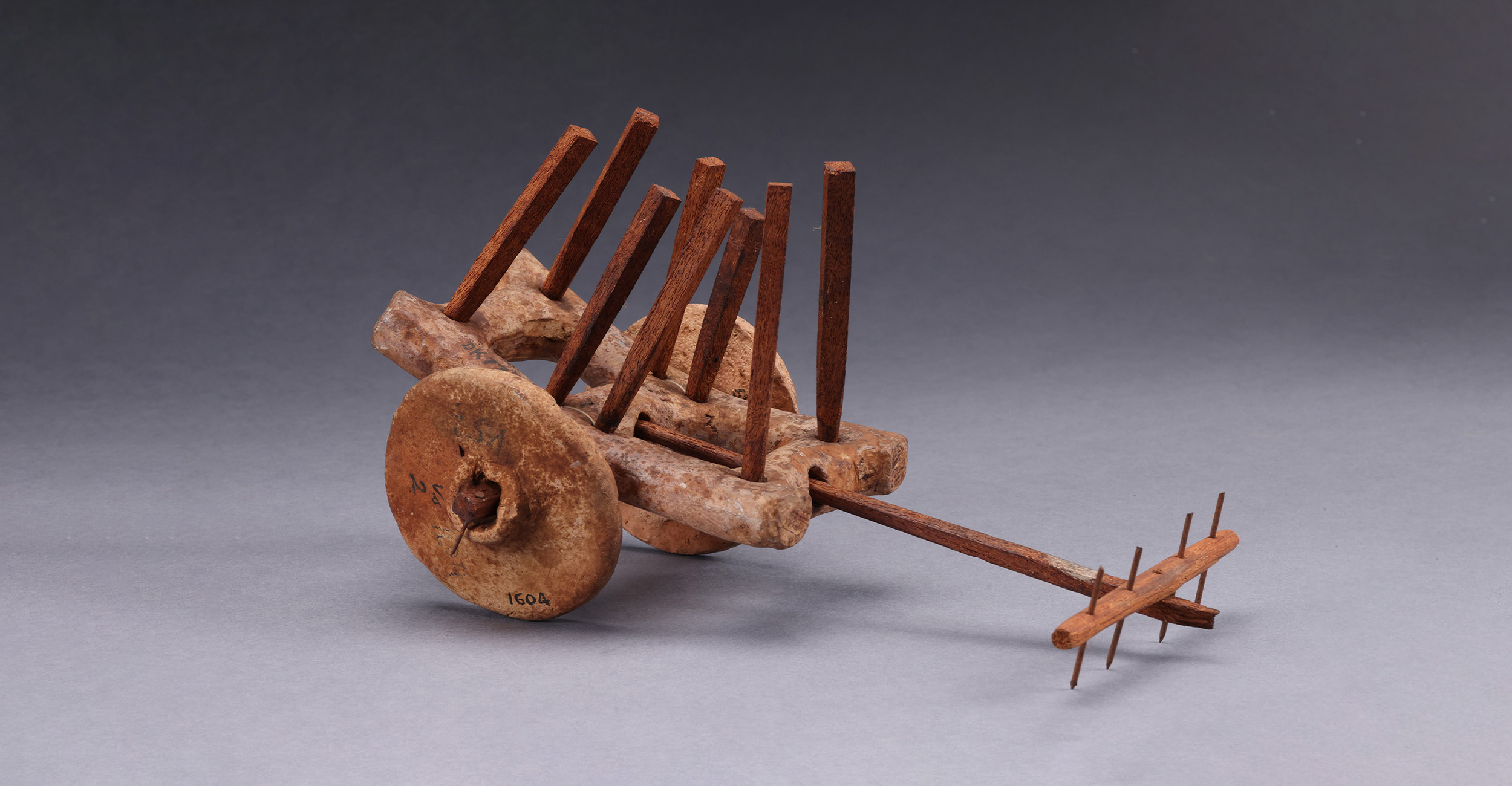 This reconstructed miniature cart with solid wheels reflects early transport technology, similar to designs in Mesopotamian cities (Ur and Kish) around 3500 BCE. Spoked wheels, enabling faster movement, may have emerged much later, around 2000 BCE.
