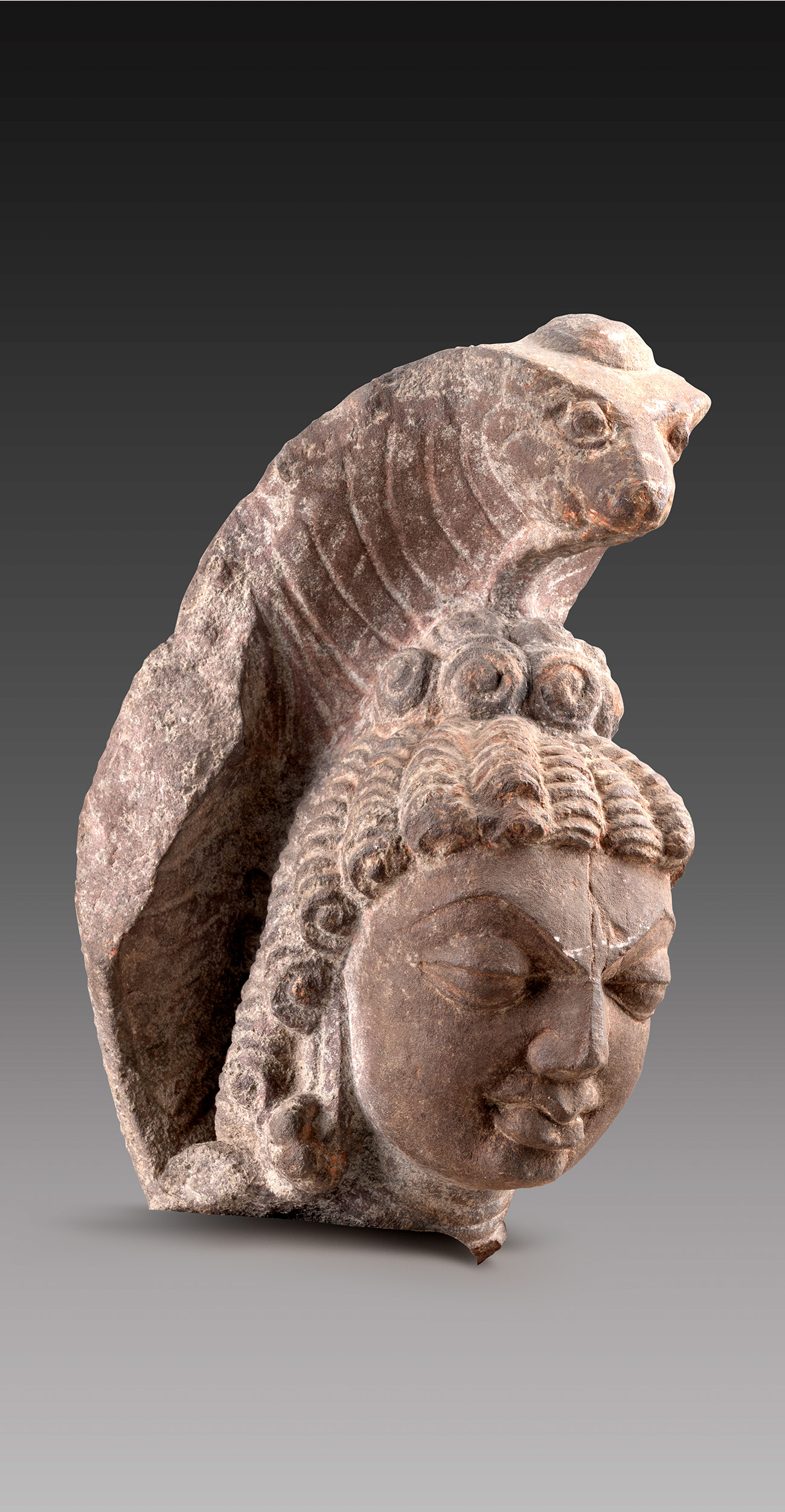 This head of serpent goddess reflects the aesthetic of the Gupta period — oval face, large eyes, noble nose, and expressive lips. Serpent worship, rooted in indigenous cults of nature worship, continues in parts of India, highlighting deep cultural and religious