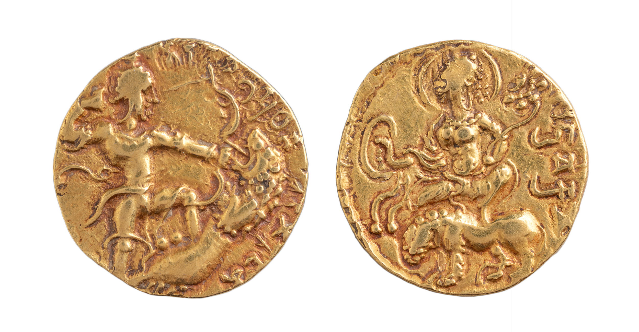 A goddess is seen seated on a lion on the reverse along with the Brahmi legend that reads ‘Simhavikramah’ denoting the king’s victory over the lion. Hunting has always been a favourite pastime of the royalty and is symbolic of courage.
