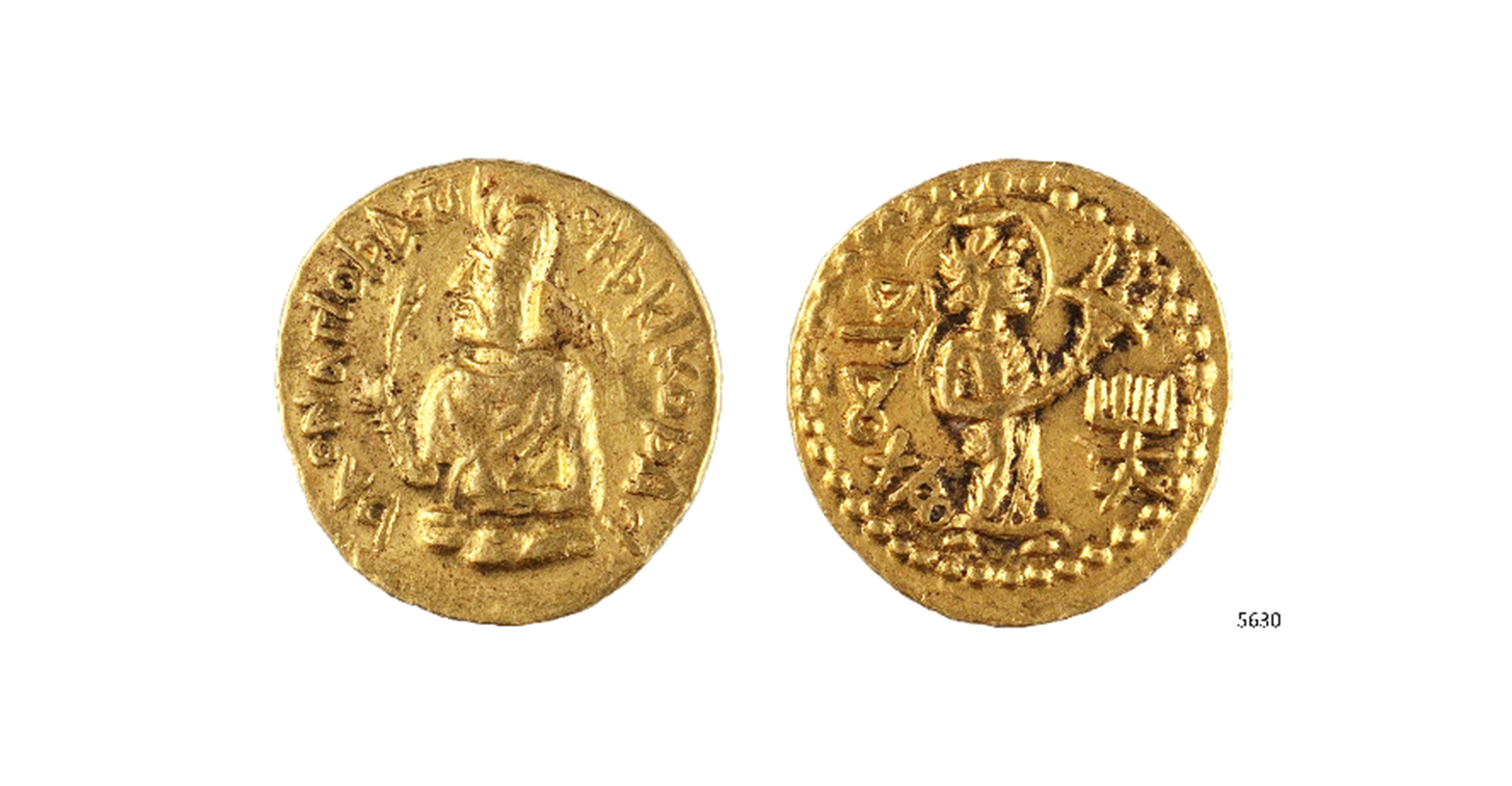 This gold quarter dinar was issued by the Kushan ruler Huvishka, who is shown as if emerging from a mountain top. Following the Greek-Roman style of profile portraiture, he is shown wearing a crested helmet. Facial features are prominent. He holds a club and a sword in his right & left hands respectively, a symbol of his kingship.