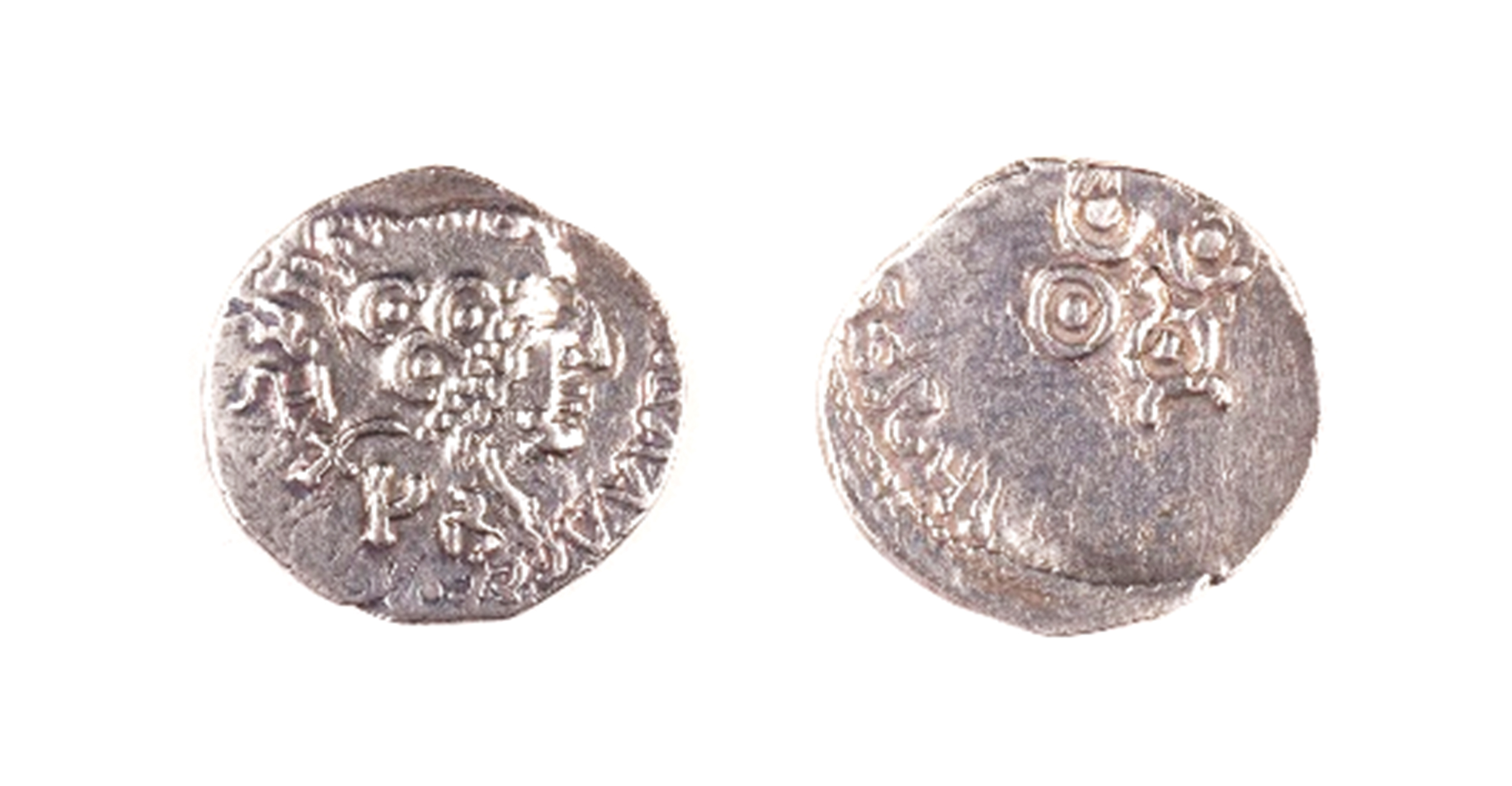 This coin was originally issued by the Kshatrapa ruler Nahapana (see bust) but was overstruck by the Satavahana ruler Gautamiputra Siri Satakarni having defeated Nahapana. The bust is that of Nahapana and the hill symbol along with his name in Brahmi over it, is that of Gautamiputra.