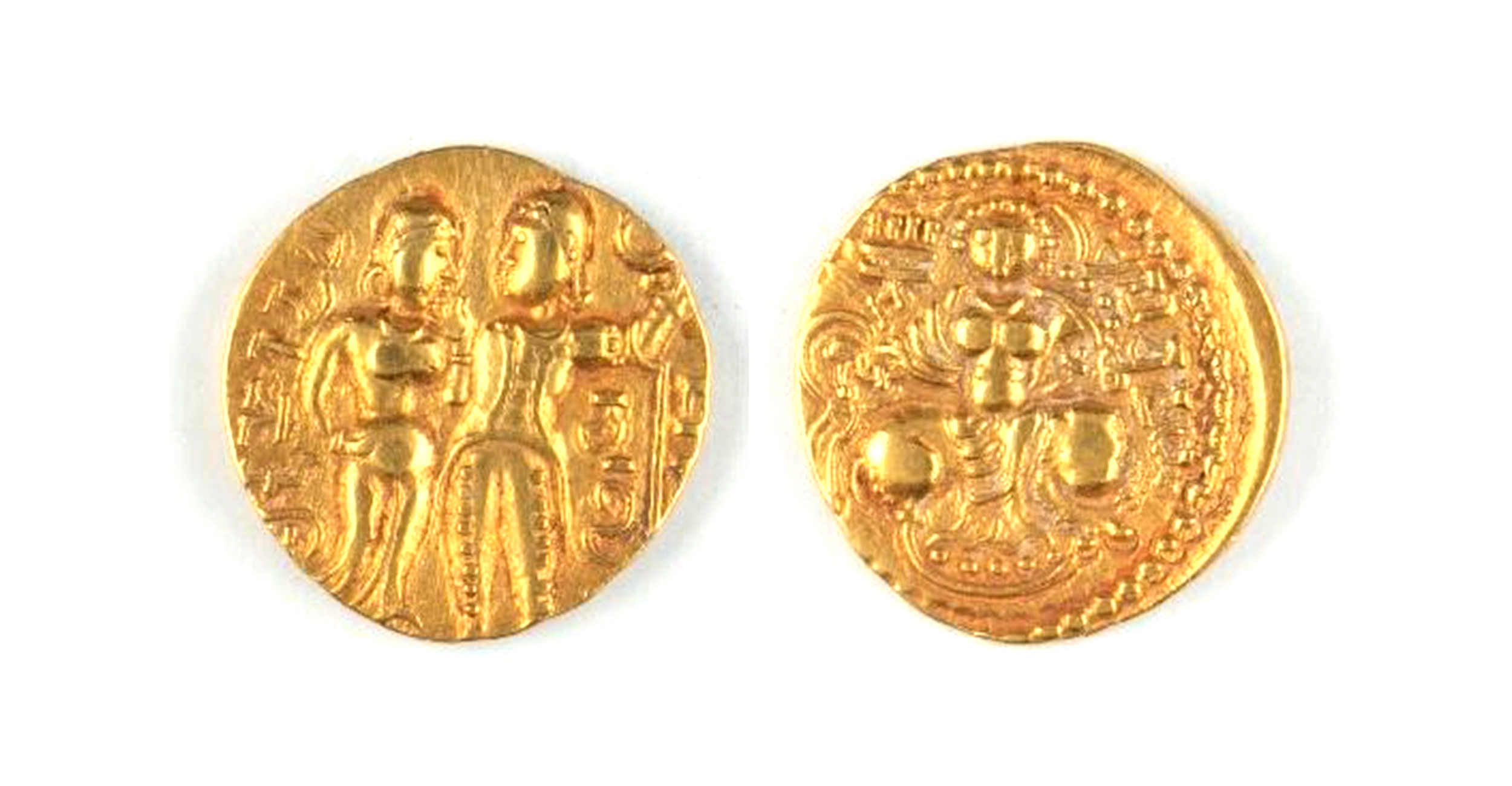 This gold dinar issued by the Gupta ruler Samudragupta (?) depicts his mother, the Lichhavi princess Kumaradevi on the left and his father King Chandragupta I on the right. Samudragupta is believed to have issued this king & queen type of coin in the honour of his parents. The Brahmi legends next to their figures help identify them.