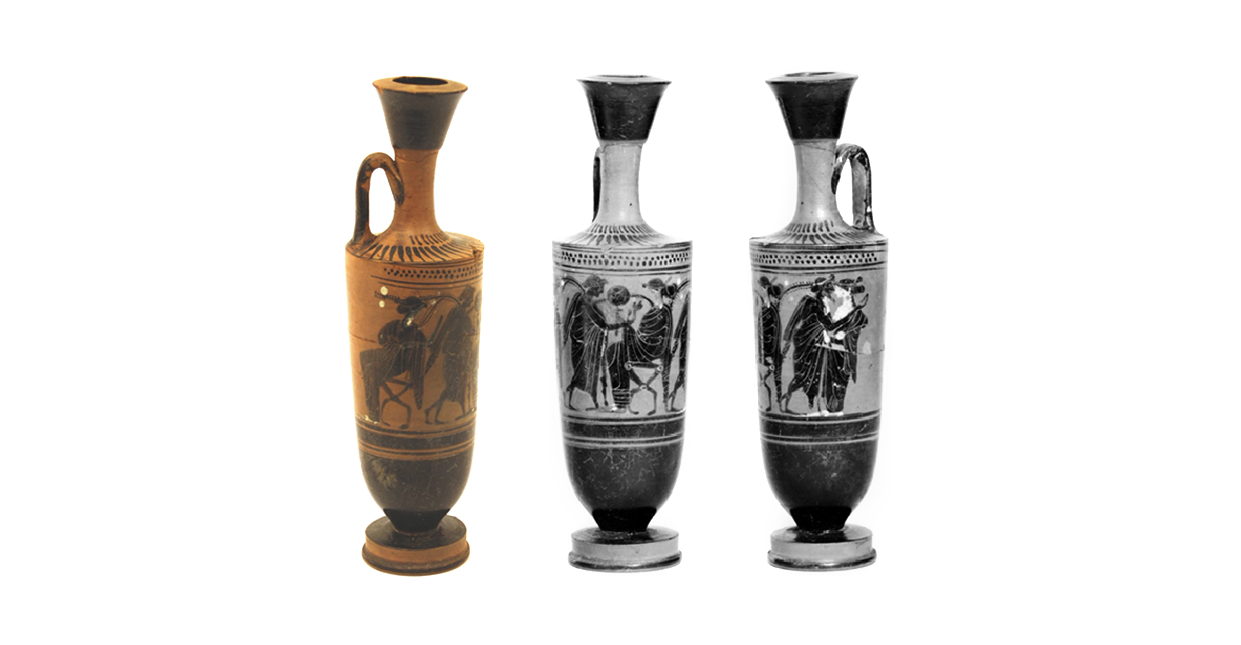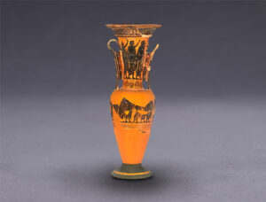 This vase shows a scene of bridal courtship. It contained perfumes and oils to anoint the bride before the wedding ceremony. The decoration alludes to the future wife’s beauty and the erotic aspects of marriage.