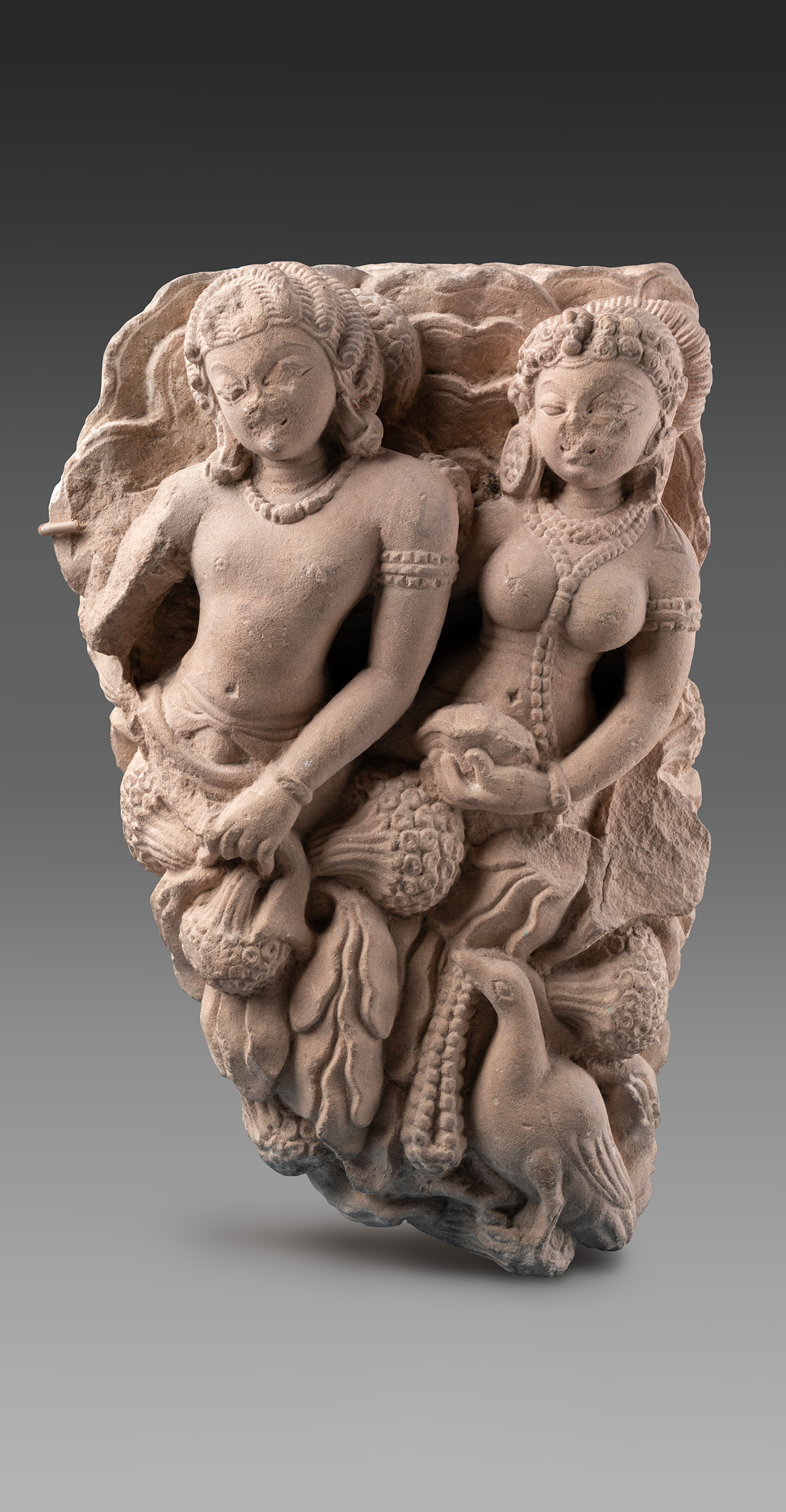 This couple symbolizes not just union but completeness or totality of life, and therefore, is considered auspicious. Emerging from a lotus lake with lush foliage, they are accompanied with a goose holding a garland in its beak.