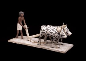 Painted wooden model of a farmer ploughing the soil with a pair of oxen.