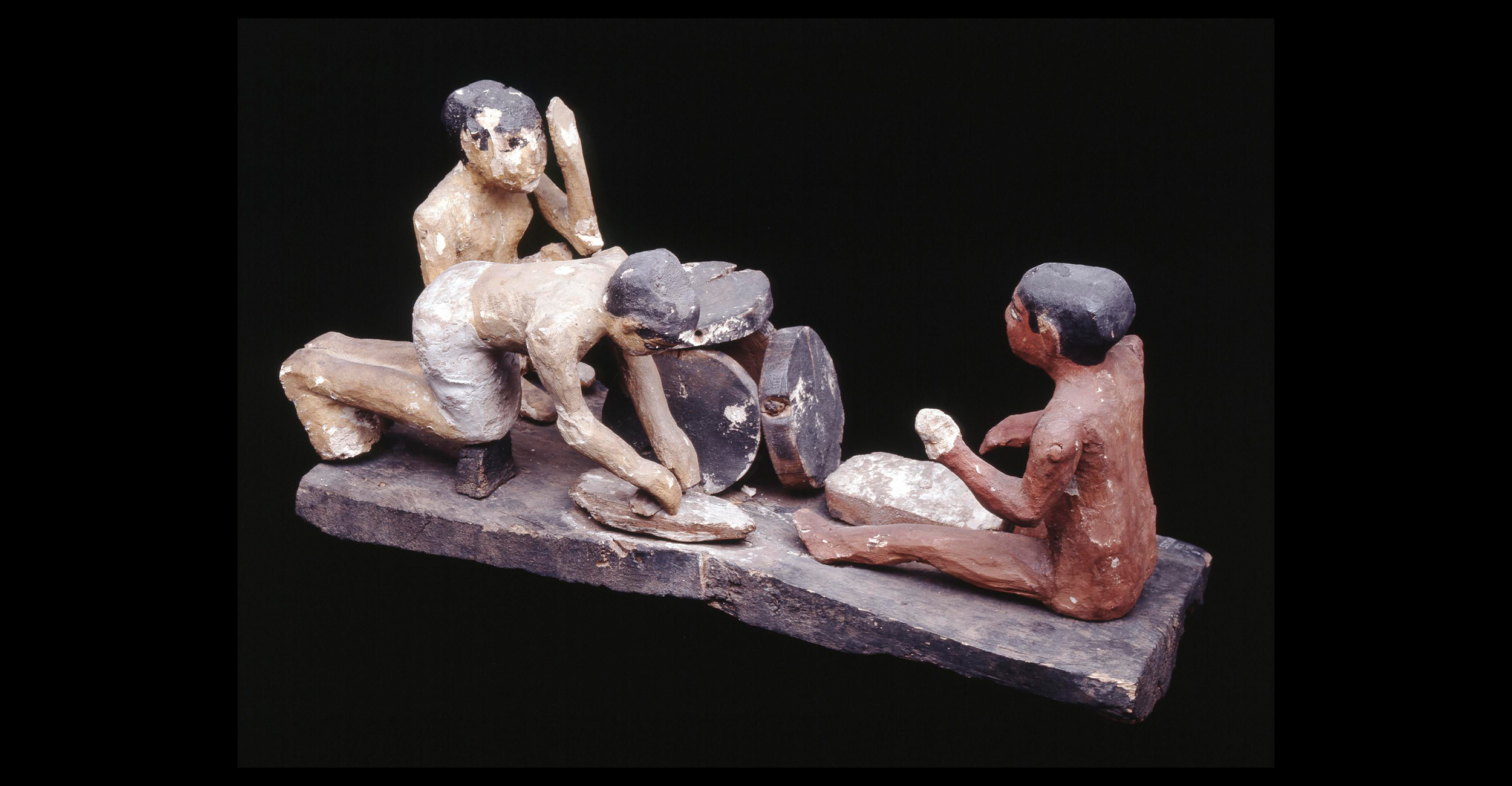This model placed in a tomb shows a kneeling woman grinding grain into flour by pushing a stone roller. A boy mixes flour with water, kneading it into dough. Another woman sits before an oven, tending the fire and shading her face from the glare. Flat loaves of bread are to be imagined inside the oven.