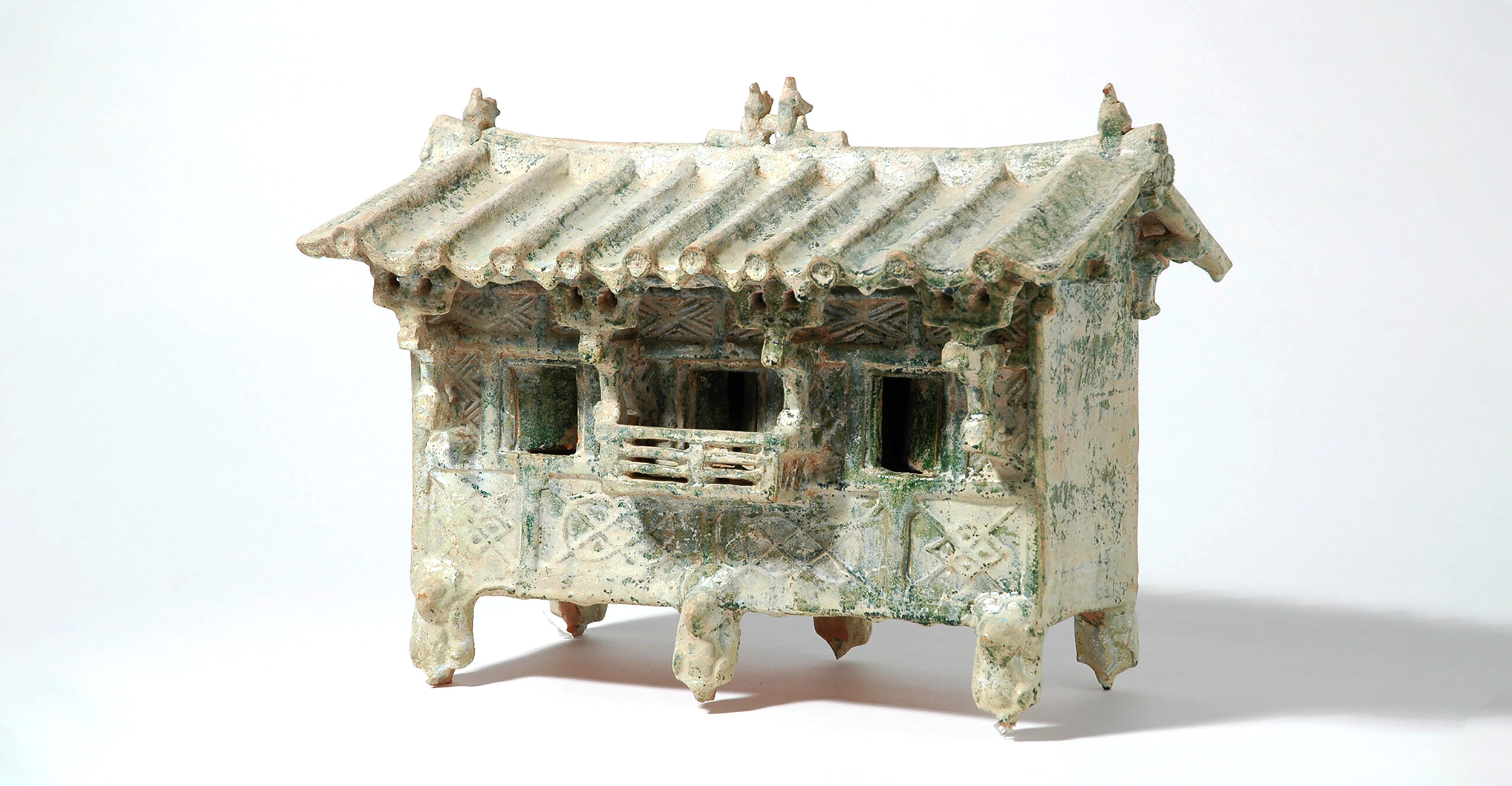 Glazed ceramic models such as this house were placed in tombs to serve the dead in the afterlife, alongside figurines of servants, soldiers, pigs, dogs and horses, as well as storage jars and agricultural tools. This was a popular practice in the Han dynasty (25-220 CE).