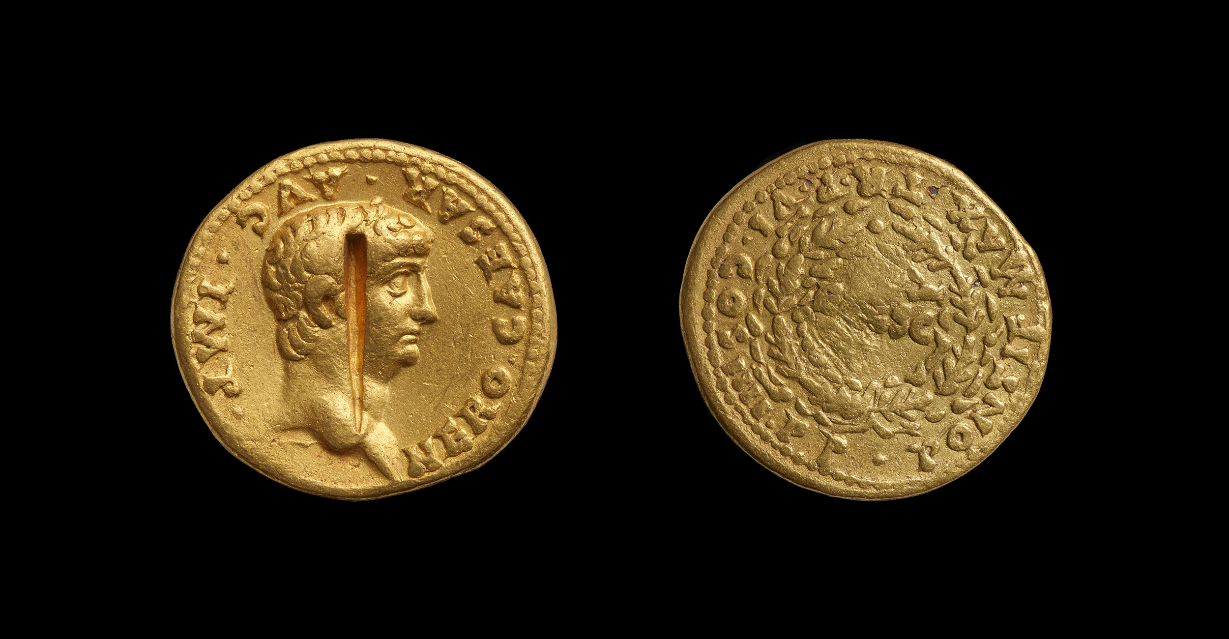 Head of Nero, bare, right. Vertical chisel-cut on head. (obverse)(obverse)