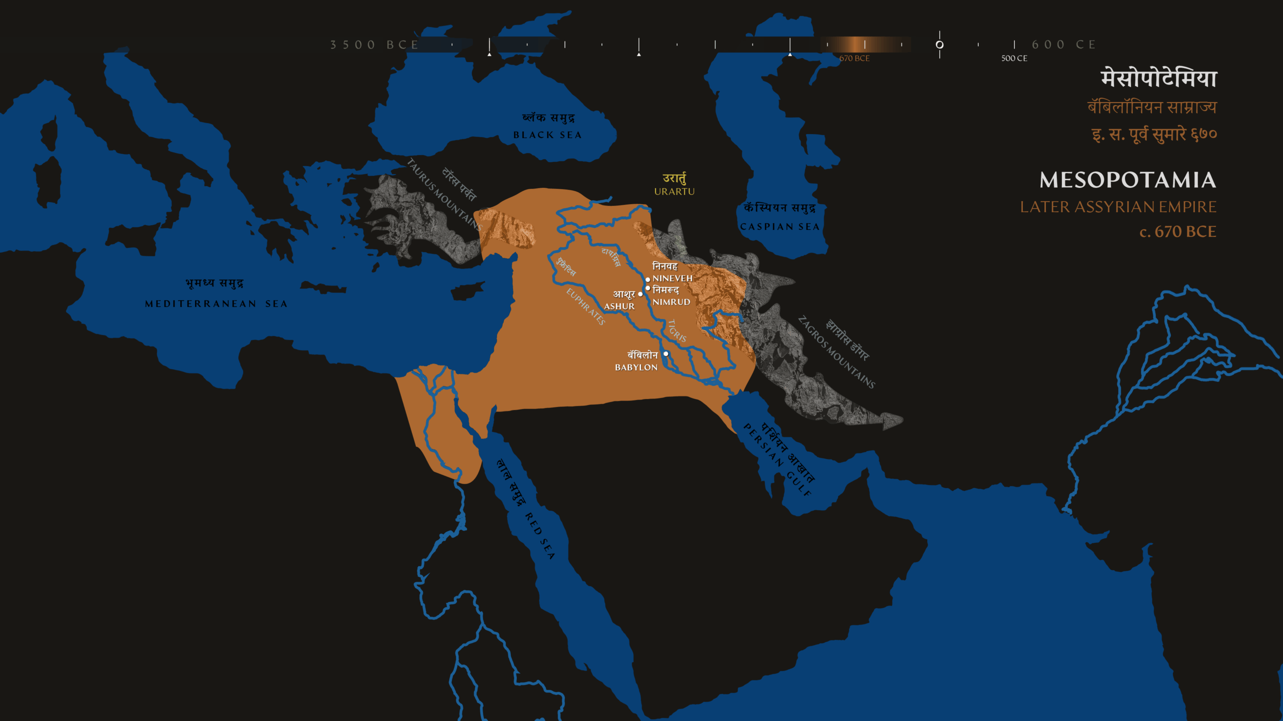 Three Assyrian soldiers, armed with bow and arrow, shield and daggers, move to the attack. To the right, in the background, another archer rides a wheeled siege engine. Around 729 BCE, the expanding Assyrian kingdom in northern Mesopotamia conquered Babylon in the south.