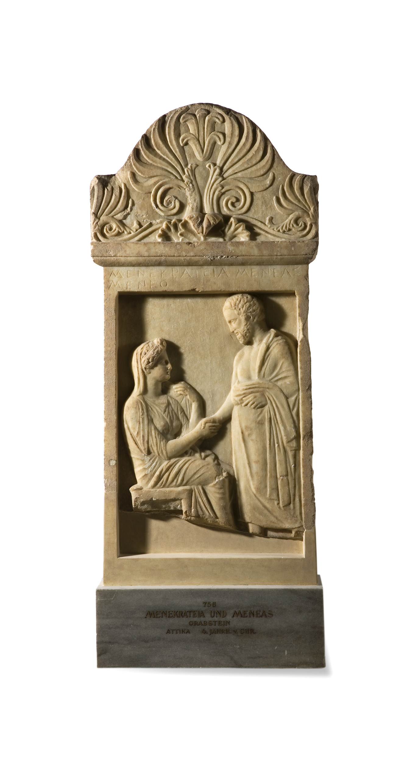 Crowned by an elaborate finial, this relief shows an Athenian married couple. The deceased Menekrateia is seated and clasps her husband’s hand in a gesture of sadness and farewell. Both are shown as model citizens – she is dressed modestly for the home, while Meneas appears as he would in public.