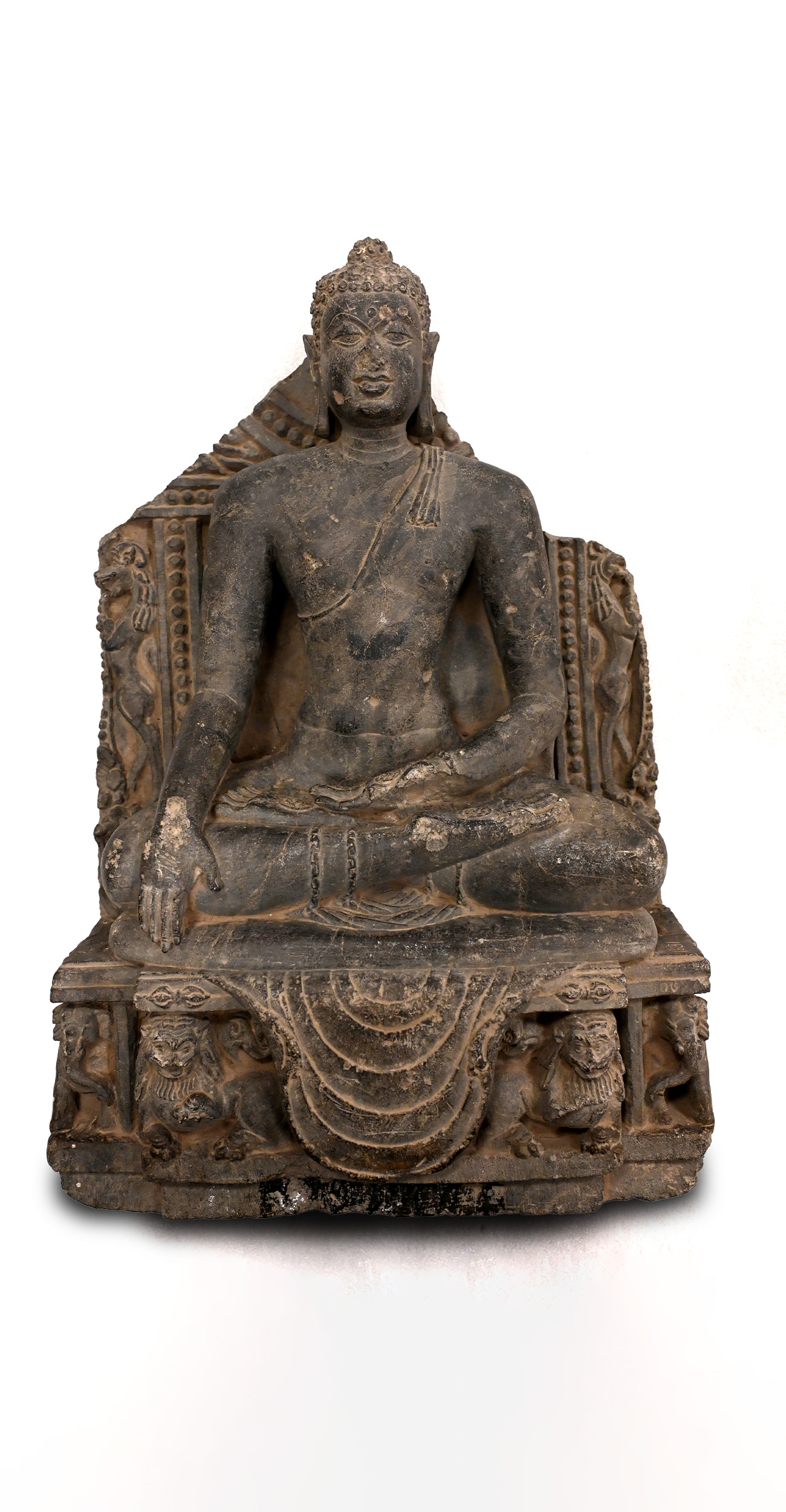 This statue from Nalanda depict the Buddha in the bhumisparsha mudra — the earth-touching gesture — symbolising the moment he called upon the Earth to witness his Enlightenment. Crafted from richly decorated black stone, the sculptures feature stylised lions, representing the Buddha’s wisdom and his fearless authority to spread the Dharma. One statue is crowned with a parasol (chatra), a symbol of royalty, spiritual protection, and reverence. These images exemplify the artistic idiom of the Pala dynasty (8th-12th century CE).
