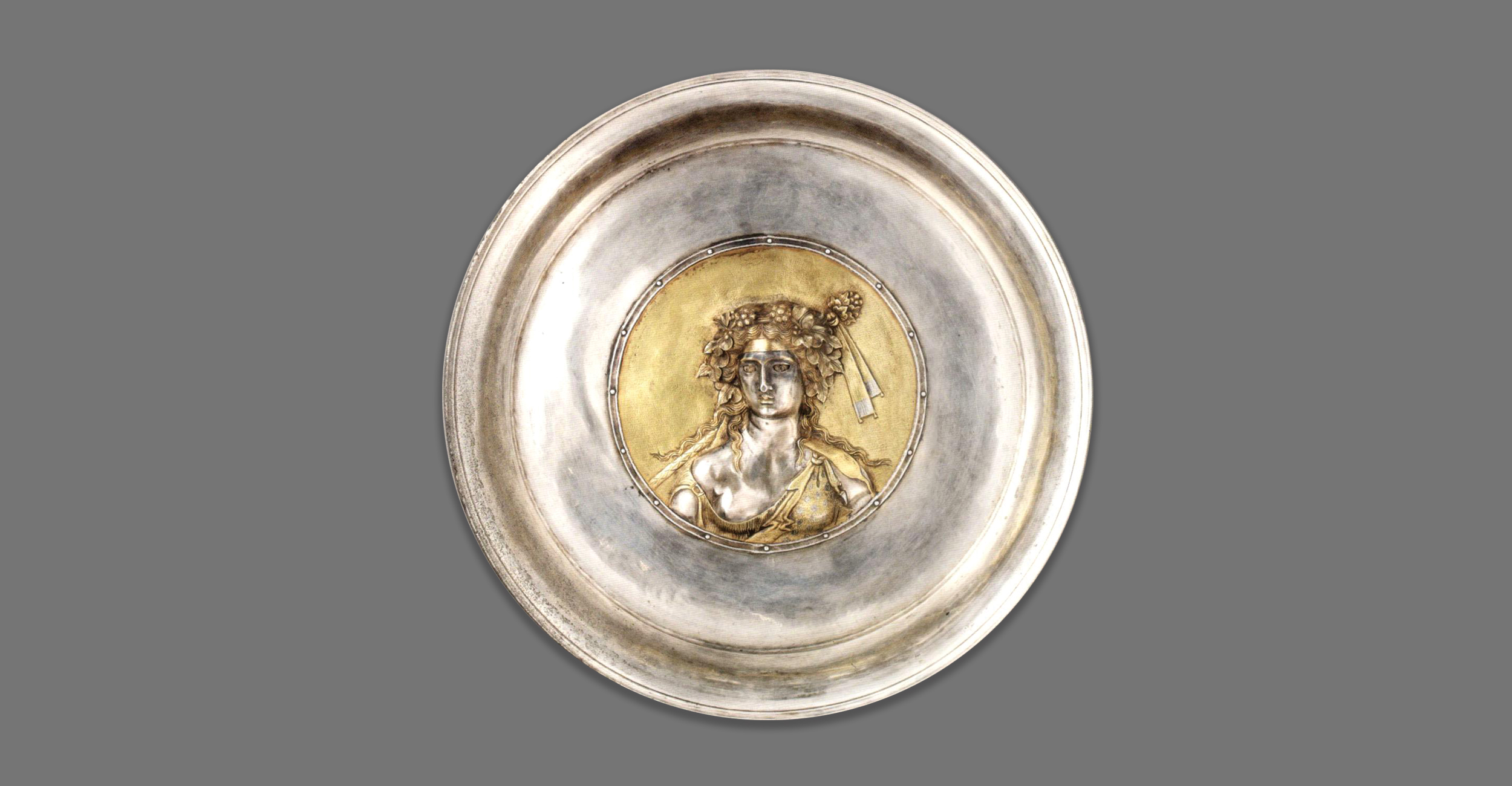 This exquisite silver dish shows Ariadne, the immortal wife of Dionysos, the Greek God of Wine and Revelry, while another dish in the exhibition shows the god himself. Gilded and in high relief, the eyes are inlaid with glass. Greek in style, they exemplify an ideal of courtly luxury extending from the Mediterranean to Afghanistan.