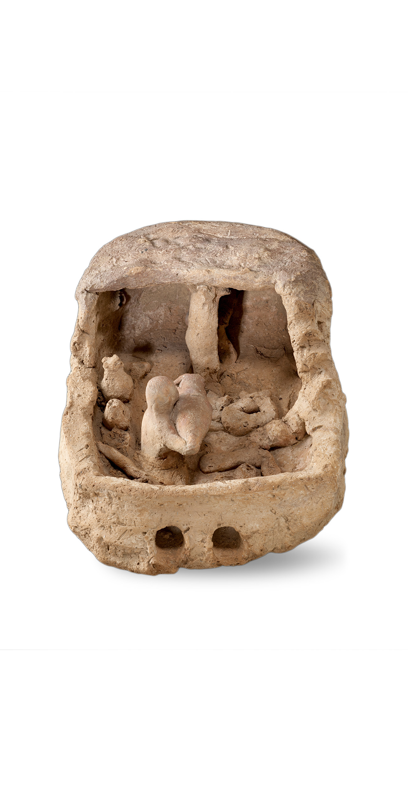 This model ‘Soul House’ was a cheap substitute for a full-sized funerary chapel, which only the rich could afford. Chapels were conceived as ‘house of eternity’, where the living brought offerings – like the meat and wine shown here. Actual liquid could be poured into the model, and drain through the two spouts in front.