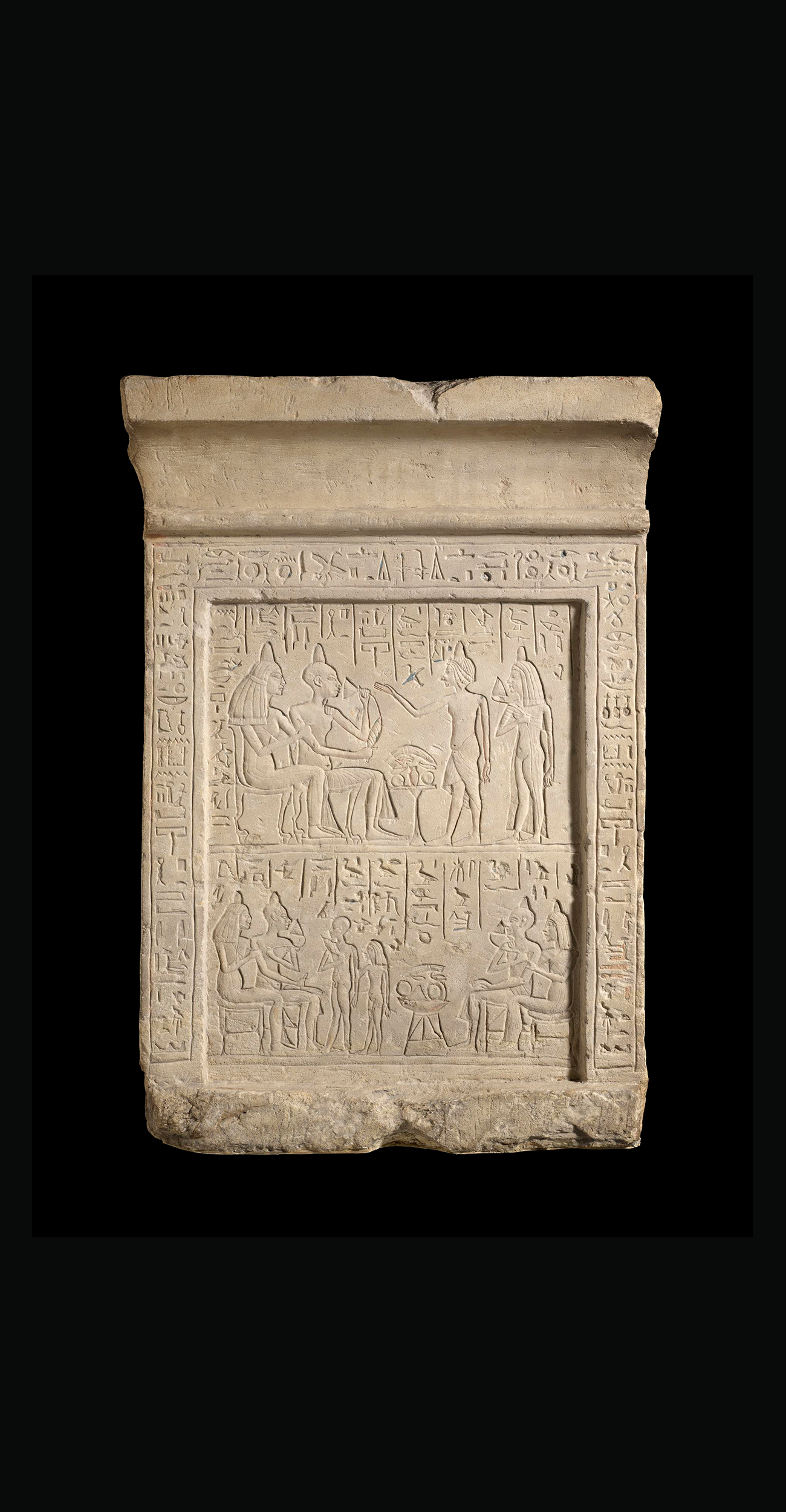 The stela shows a close-knit family group from ancient Egypt. The son Pa-Aten-em-heb and daughter Meryt-Ra, stand in prayer before their deceased parents – Ptahmay, an Egyptian official and ‘guardian of the treasury’, with his wife Ta-kharut (‘the Syrian’). On the left sit the dead husband and wife, with perfume cones on their heads. In front of them, their son and daughter pray for them. On the table are the offerings: a drink vessel, two loaves, two gourds, ribs of meat, and a bundle of spring onions.
