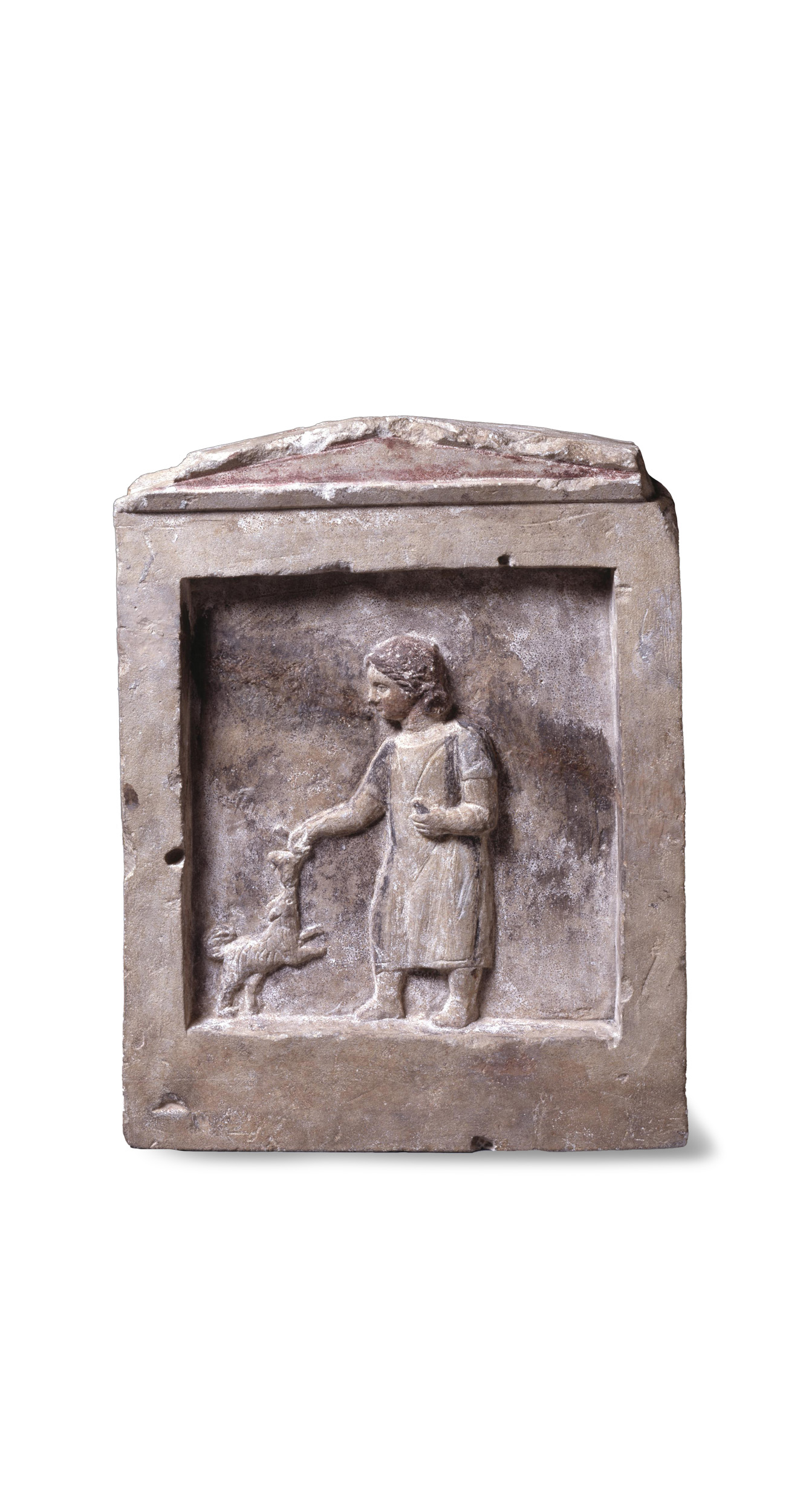 Most children’s lives ended in early death. On this tombstone from Egypt, a little girl holds a bird, while playing with a pet dog. Her tunic and shawl show her to be a rich Greek child. Her name would have been painted on the top. Birds often represent the soul.