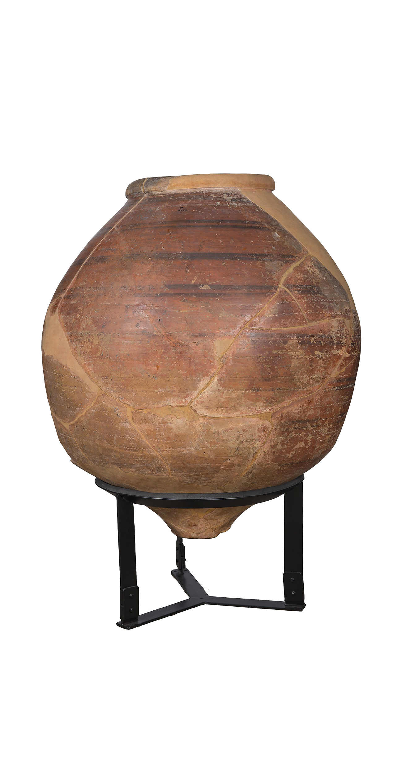 Wide-mouthed, large jars such as this one were used for storing grains, water, oil, and wine. How much (volume) could this jar hold 300 litres of liquid or 240 kgs of grain. The minimal decoration on this pot is typical of Harappan pottery of this time. Many would have been stored in granaries to supply in times of drought.