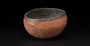 The largest and most beautiful clay vessels of ancient China come from the upper Yellow River. This pot was fired at around 1000 degrees Celsius, making the clay very tough. Handles are strategically placed to ensure the vessel doesn’t topple when picked up. The glaze and elaborate painted patterns in the shape of gourds and nets show this was a high-status object. Rich burial tombs had as many as 100 painted pots like this for the afterlife.
