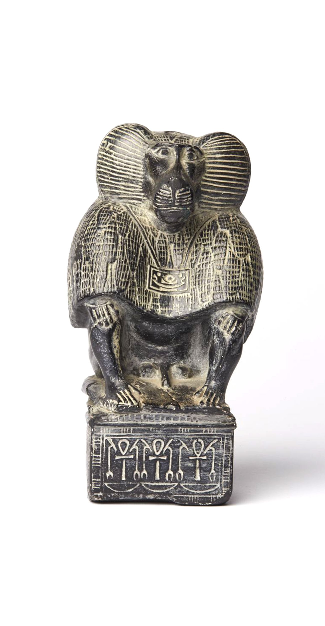 Thoth, ancient Egyptian God of Wisdom represented as a baboon, was believed to have invented writing. Ancient Egyptians observed the intelligent behaviour of wild baboons and interpretated their calls as chants to the rising sun, the chief God Ra. As a scribe, Thoth registered the verdict during the ‘Weighing of the Heart’— an important rite of passage, as the dead moved into the afterlife.
