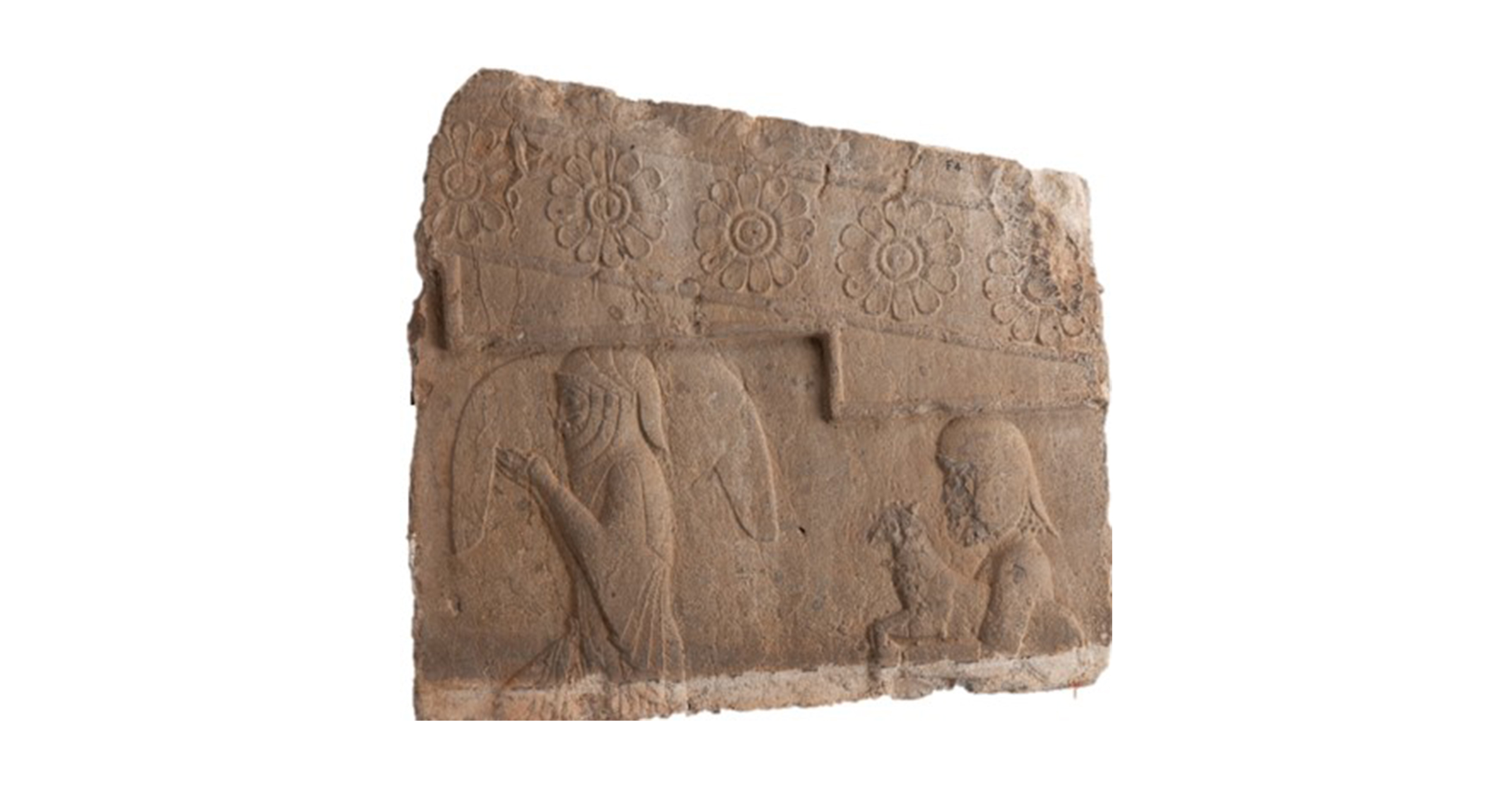 Two servants carry food (a covered tray and a lamb) for the king’s table. They have curled beards and hair and wear Persian knee-length tunics with long, flared sleeves. The relief probably comes from the western stairway of the palace of Xerxes I in Persepolis.