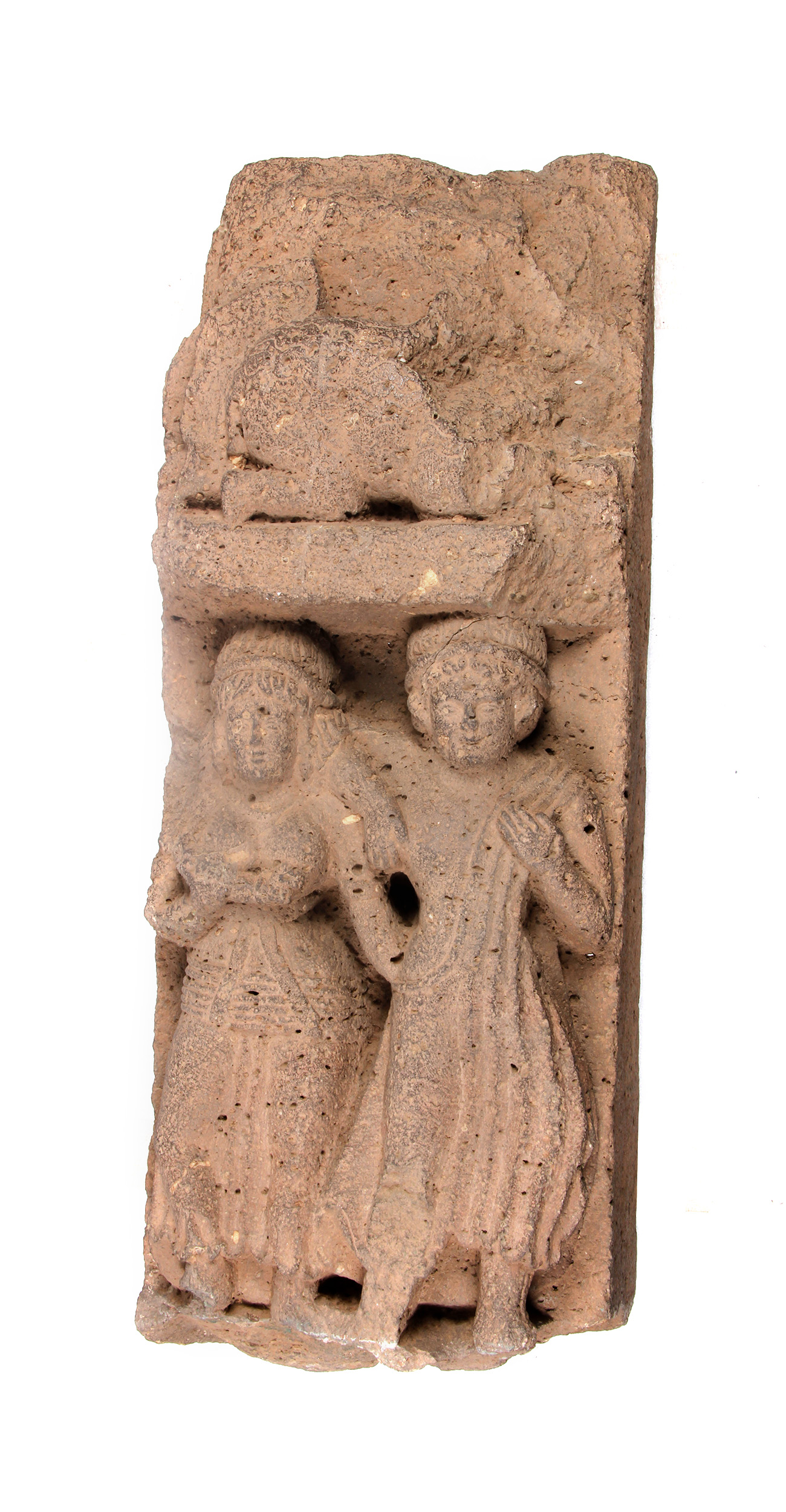Trade moves not only goods but people, and traders often integrate into other societies and cultures. Here, in this relief from a Buddhist monastery cave in Pitalkhora, Maharashtra a donor couple, probably from the Mediterranean, wear recognisably foreign dress and hairstyle.